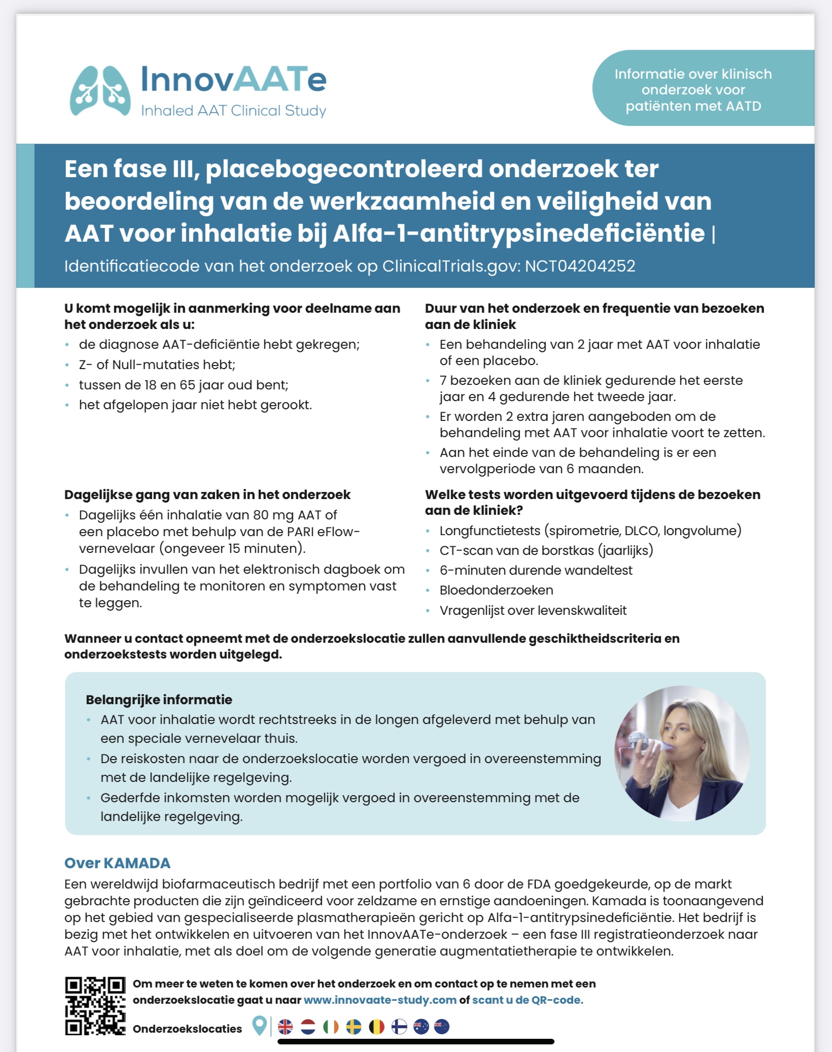 14-01-2025 om 08:34 uurInnovAATe is een klinisch fase 3-onderzoek, waarin de veiligheid en werkzaamheid van geïnhaleerd Alpha-1 antitrypsine (AAT) worden getest bij volwassenen met een longziekte die het gevolg is van Alpha-1 antitrypsinedeficiëntie.