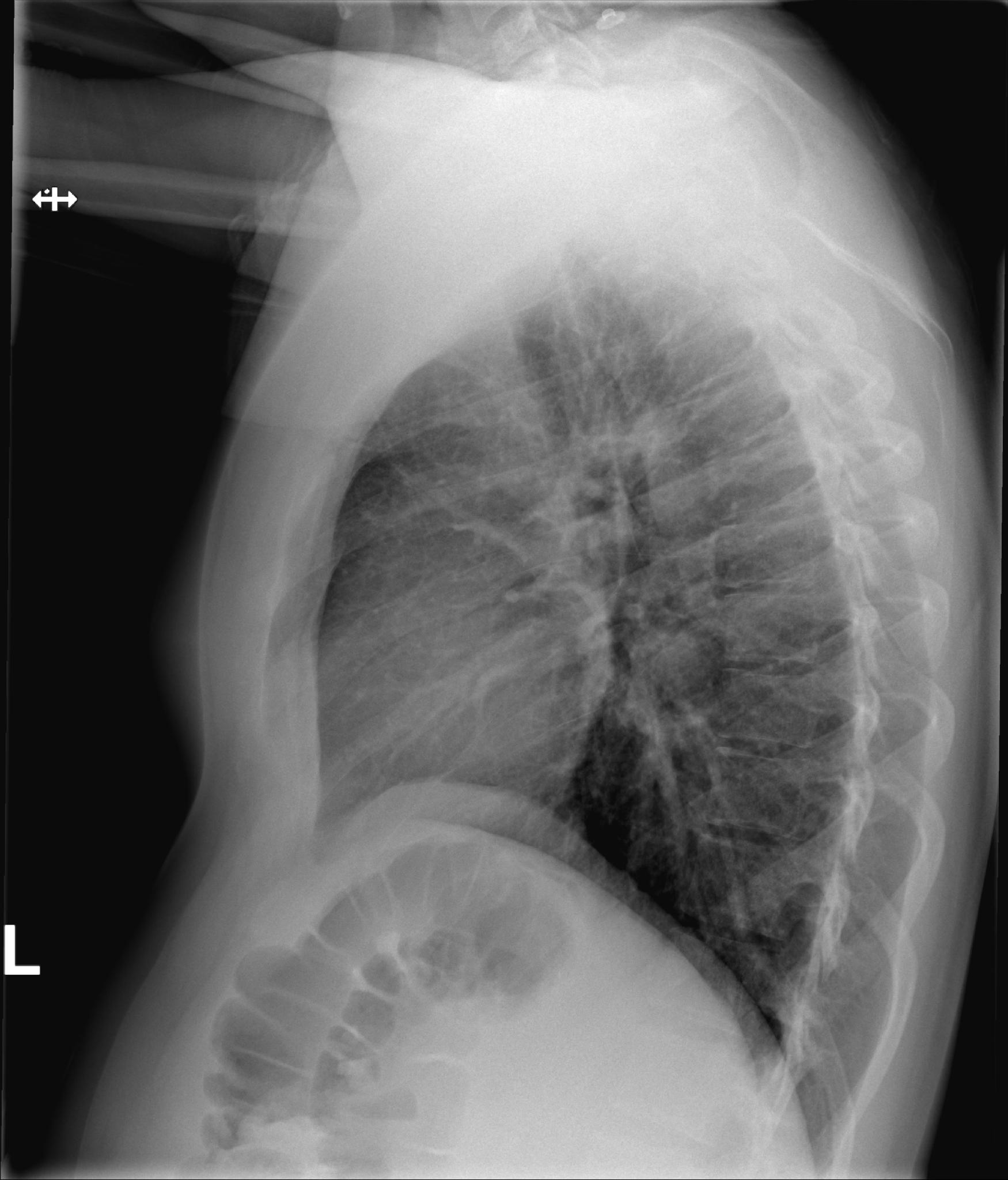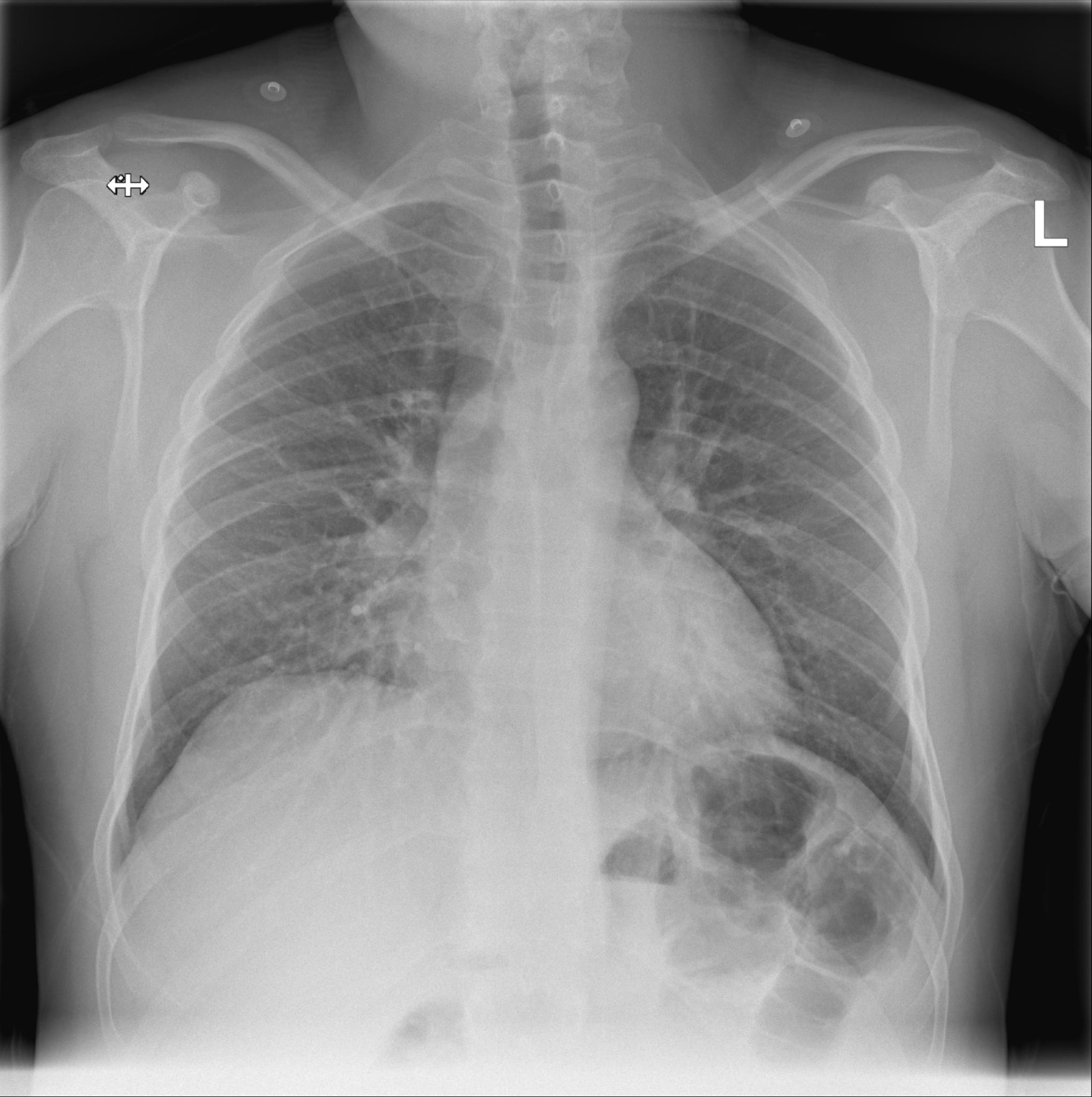 Scherp afgrensbaar diafragmakoepel. Heldere sinus pleura. Slank mediastinum superior. Hili opgebouwd uit bronchovasculaire structuren. Corfiguur binnen de norm. Longvaattekening binnen de norm. Geen circumscripte consolidaties. Echter matig afgrensbaar rechter harthelft. Afgebeeld bovenbuik zonder bijzonderheden. Skelet zonder relevante nevenbevindingen. Conclusie: Geen circumscripte consolidaties. Echter matig afgrensbaar rechter harthelft, beginnende consolidatie middenkwab niet uit te sluiten.