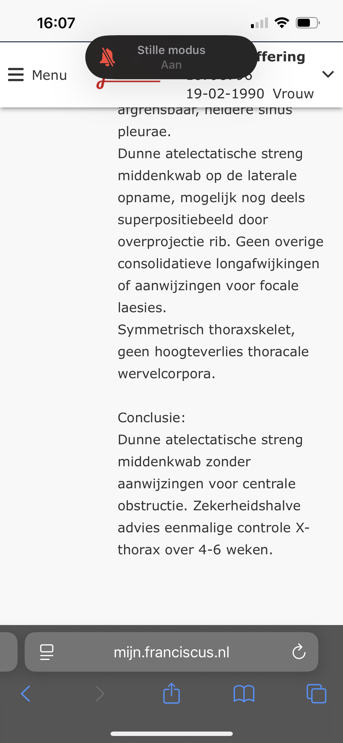 Een dunne atelectatische streng is een klein stukje longweefsel dat is samen gevallen. Er zijn geen aanwijzingen voor een tumor. Dit is niet erg verontrustend. Overleg met jouw behandelaar hoe dit verder gecontroleerd moet worden. EEn foto over 4-6 weken herhalen is een optie.