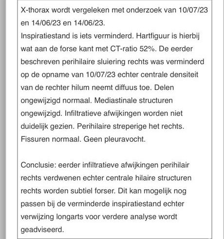 Mijn vriend heeft 2 x in korte tijd een longontsteking gehad en vanaf juli nu 3 foto’s gemaakt. Zojuist deze uitslag ontvangen, wat kan dit betekenen? (wordt na het weekend uiteraard ook aan de arts gevraagd maar wellicht hier geluk met eerder reactie. Hij voelt zich sinds 2 dagen (foto is gister gemaakt) ook weer minder lekker en zelf denken we dat hij weer longontsteking begint te krijgen: