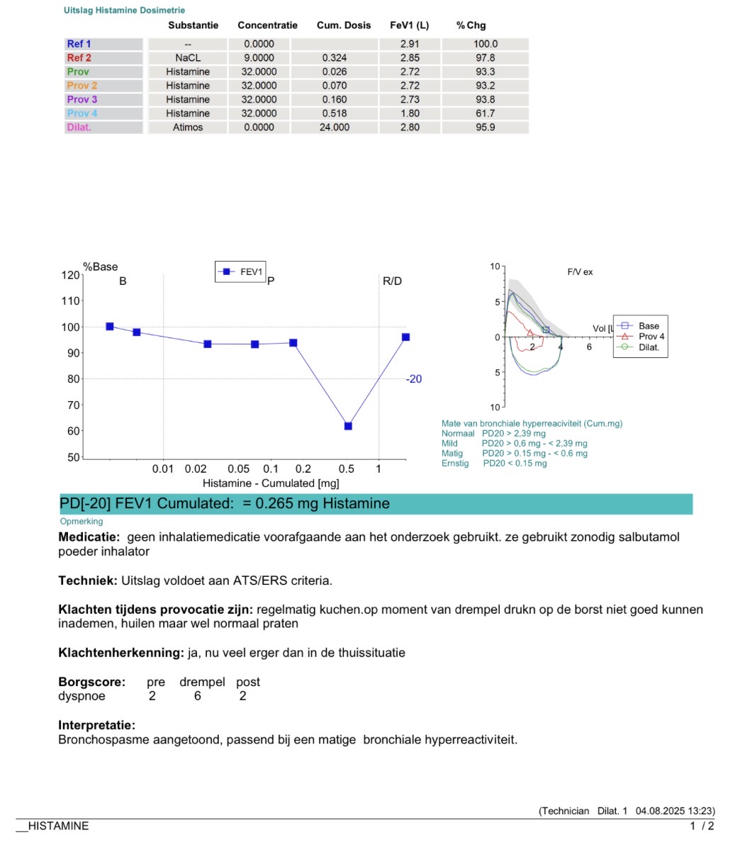 De reactie op histamine laat duidelijk astma zien: je reageert met duidelijke longfunctie daling na een paar doses histamine en na een luchtwegverwijdend medicijn komt je longfunctie weer mooi terug op de oorspronkelijke waarde