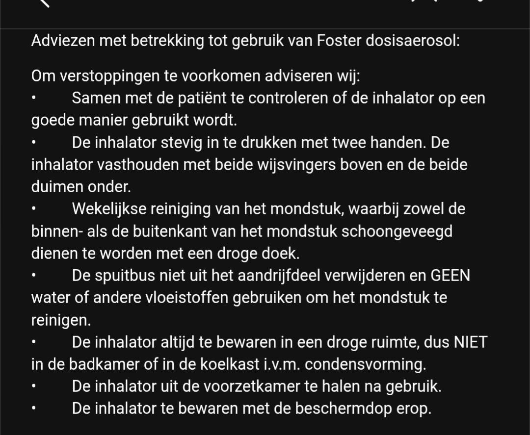 19-08-2025 om 20:06 uurIk gebruik een Foster 200/6. Deze zit meestal 1x verstopt rond de 40 e verstuiving. wat ik nu doet , buiten de normale schoonmaak perikelen, trek ik de aluminium koker eruit en zet hem in een mok met warm water, en laat hem zo even staan. Dit helpt soms, maar die witte aanslag binnenin zit behoorlijk vast. Dus ook uit dat kleine gaatje waar het gas uinkomt. Dit ook al eens gemeld bij mn apotheker maar die wilde er niets mee. Hij ligt thuis in een keukenkastje opgeslagen. Weten jultieme nogen een oplossing