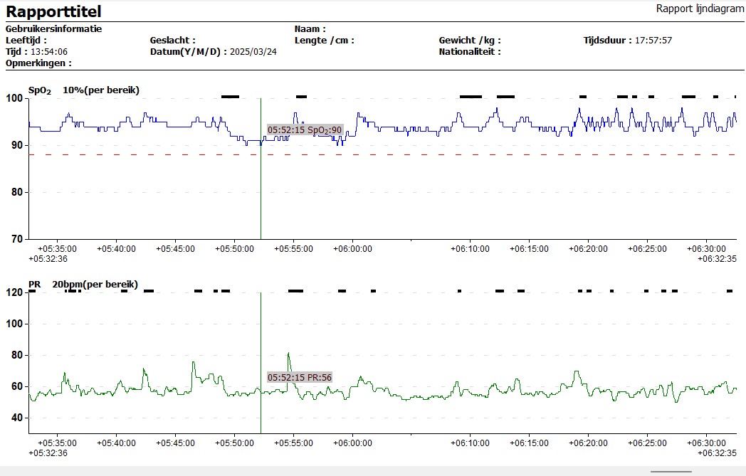 25-03-2025 om 08:56 uurGoedemorgen, de laatste maanden wordt ik snachts vaak wakker. In het begin constateerde ik een hoge hartslag en had daarna moeite om weer in slaap te vallen. De laatste 2 maanden merk ik dat ik naar adem hap als ik wakker wordt en soms zelfs lichte blackouts heb. Ik heb een 24 uurs saturatiemeter gekocht en mijn saturatie schommelt de hele nacht met dalen rond de 90 (zie foto). Ik ben bij de dokter geweest en die heeft een slaaponderzoek gedaan waaruit centrale- en hypoapneus komen. Moet ik mij zorgen maken?