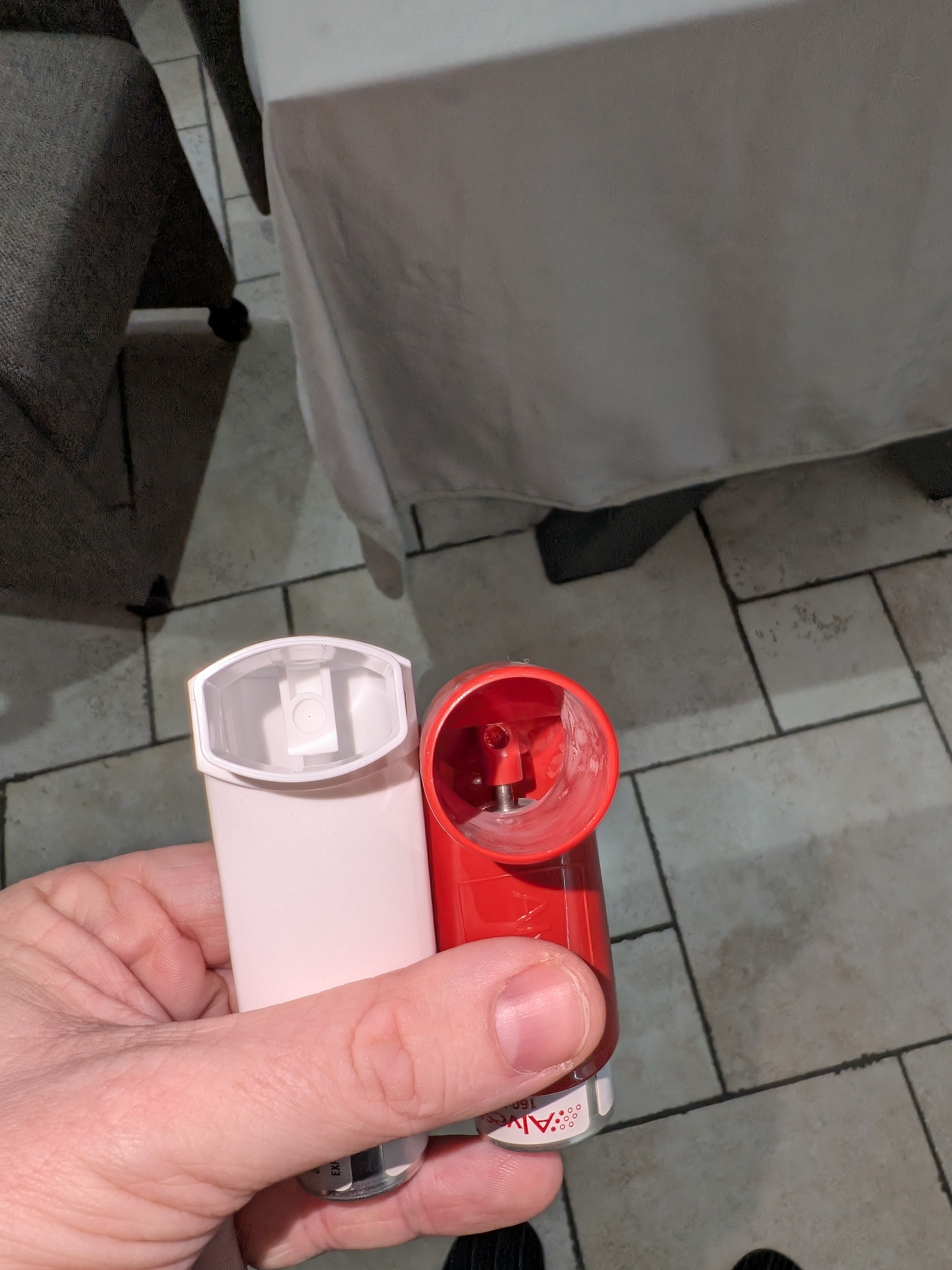 Ik heb een normale (blauwe) aerochamber voorzetkamer. Naar de alvesco heeft een volledig rond uiteinde. De atimos een normaal uiteinde wat goed in de aerochamber past. Aldus de apotheek moet ik de ronde gewoon erin duwen en dan rekt het wel. Dat klopt, maar dan blijft er ook deels een opening waardoor ik zodra ik puf gelijk veel lucht lekkage zie en ik dus fors minder medicijn binnen krijg dan benodigd.