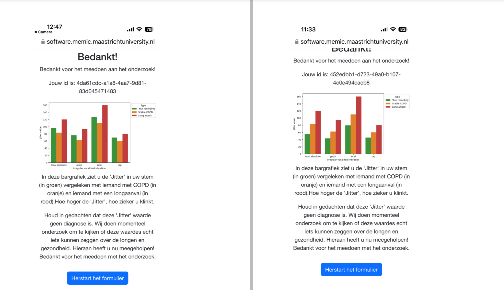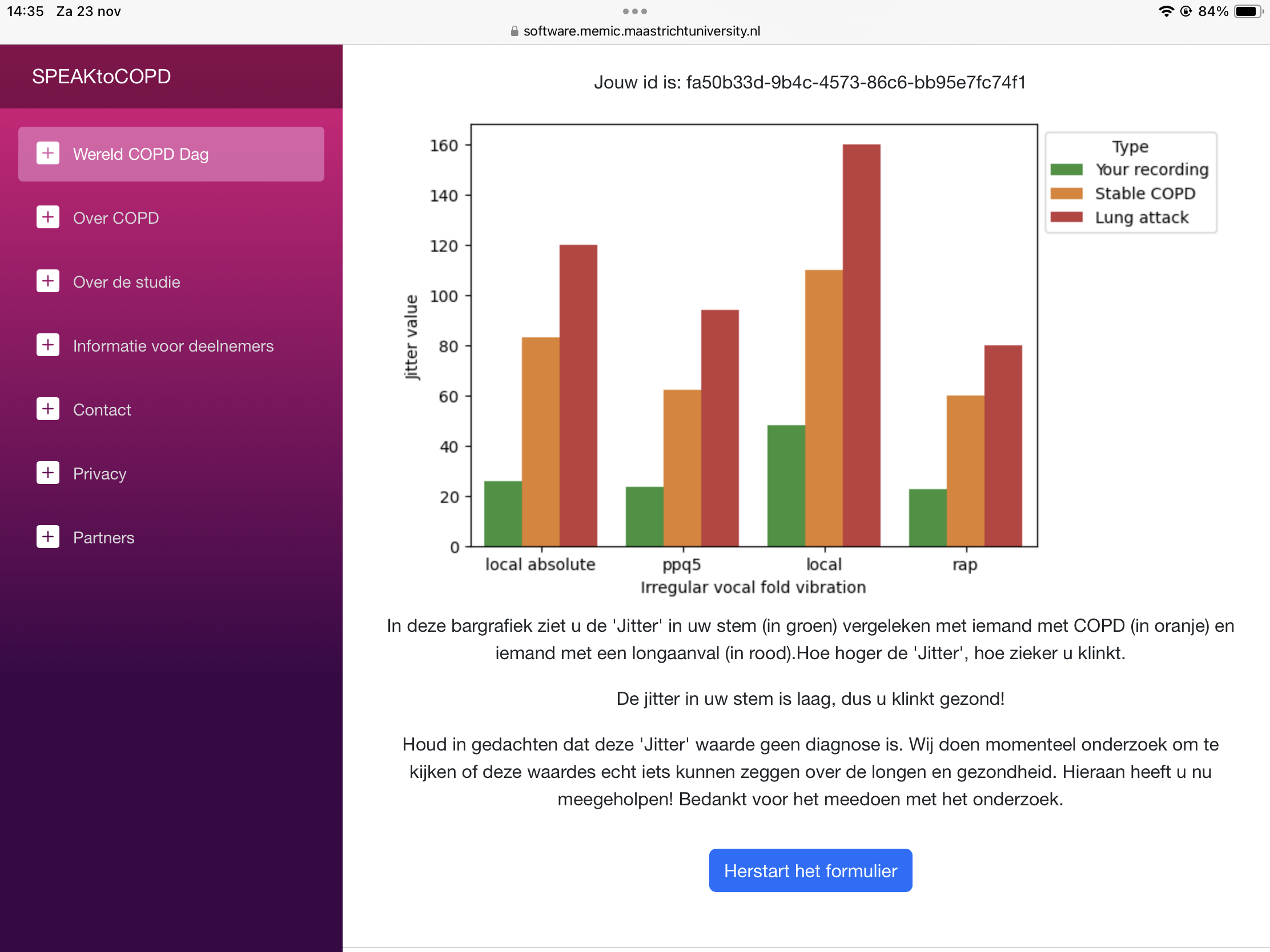 Hoi Gert, ik heb net mijn stem gedoneerd voor de stemtest! Was leuk om te doen! En ook heel leuk dat er een grafiekje uitrolt op basis waarvan ik kan zien of ik een longaanval heb of niet (wist ik natuurljjk al, maar toch)! Hoeveel meetapparaten heb jij wel niet thuis? Groet, Marikey