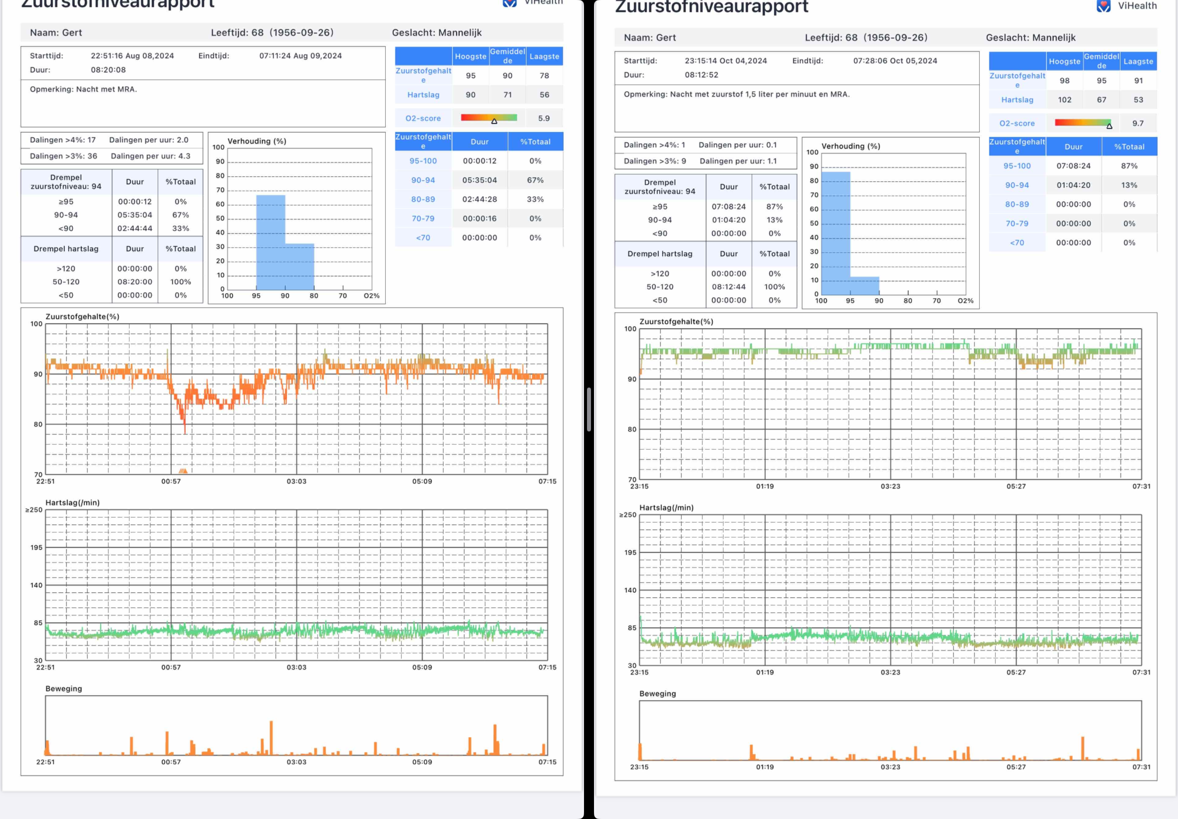 Nu heb ik een paar dagen met neusbril geslapen en dat is mij erg meegevallen. Ik kan nog niet zeggen of het fysiek effect heeft maar de data uit de duurmeting staan allemaal in het groen. De gemiddelde saturatie is nu 94% en er zijn geen uitschieters meer onder de 90%. Zie de verschillen in de bijlage.