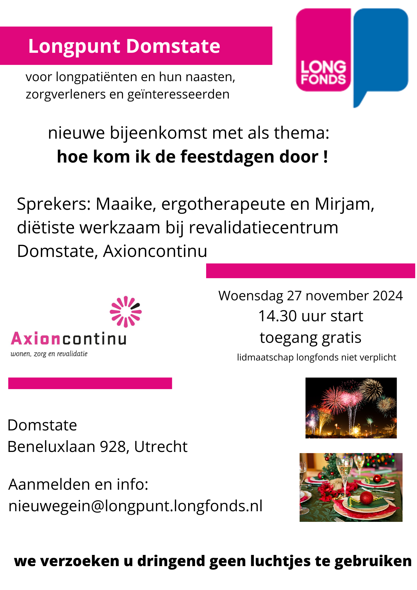 26-11-2024 om 09:06 uurVindt u het ook een uitdaging om de feestdagen goed door te komen. Of ziet u er als een berg tegenop vanwege kaarsjes, geuren, drukte....op woensdag 27 november gaan we in Longpunt Domstate (utrecht) hierover met elkaar in gesprek en hopen met tips en trucs elkaar te helpen om de feestdagen nog mooier te maken dan dat ze al zijn. Ergotherapeute Maaike Kling, revalidatiecentrum Domstate, zal hierover een en ander vertellen.