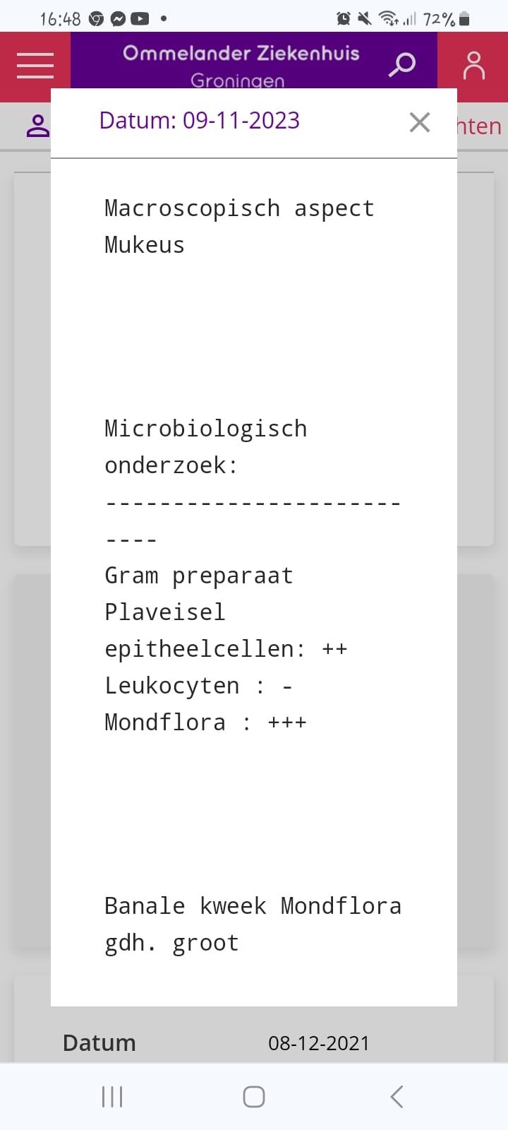 Door Deugenietje Weet iemand wat dit betekent? 14-11-2023 om 22:37 uur Weet iemand wat deze afkortingen betekenen? Groetjes Sabine Login of registreer om te reageren Naar de laatste reactie gaan? Latenb 16-11-2023 om 10:22 uur Sabine Deze cijfers zeggen mij ook niets. Maar vraagt het aan je longarts of longverpleegkundige of huisarts. Groetjes van Bert Login of registreer om te reageren Daantje 16-11-2023 om 12:14 uur Het is geen schone sputum kweek geweest maar verontreinigt met bijvoorbeeld speeksel uit je mond (mondflora noemen ze dat). Login of registreer om te reageren Willem Kamping 11-01-2024 om 00:01 uur Ik kan je verwijzen naar de site labuitslag.nl. Daar vind je info over allerlei testuitslagen en hun verklaringen. Succes. Login of registreer om te reageren