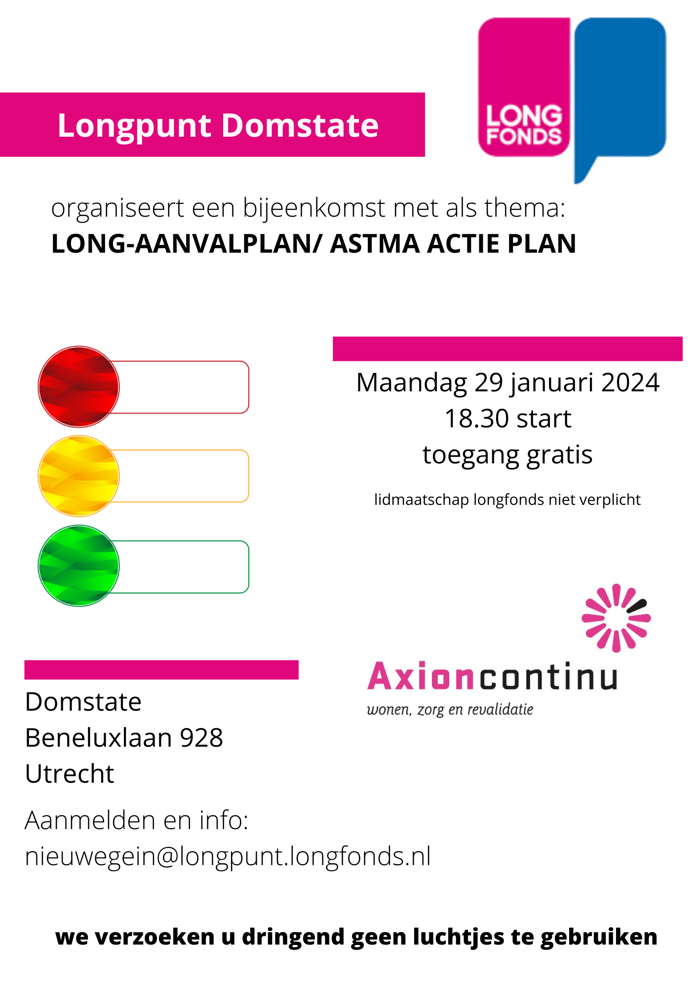 15-01-2024 om 11:57 uurop maandag 29 januari is er een bijeenkomst in Domstate georganiseerd door Longpunt Domstate. Het thema van de avond is LongAanvalPlan en AstmaActiePlan, wat is, wat heeft u er aan en hoe kan het u helpen om uw longziekte beter stabiel te houden